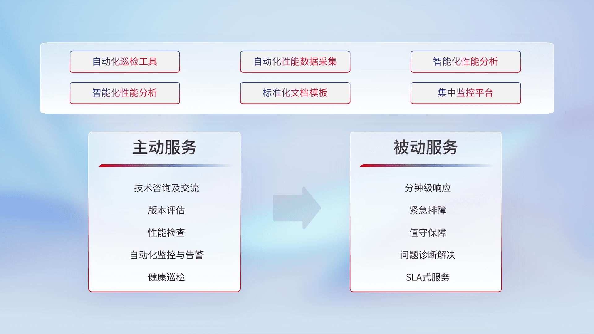 智能化工具和标准化文档,,,保障服务质量,,,提供主动服务(包含技术咨询、、版本评估、、、性能检查、、、自动化监控与告警、、健康巡检)和被动服务包含(分钟级响应、、、紧急排障、、值守保障、、、问题诊断解决、、SLA服务)。。